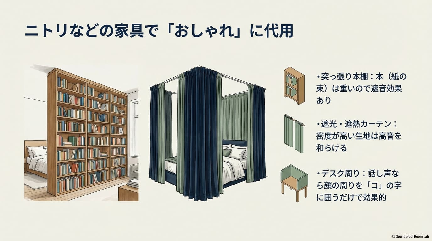 これらの方法は、専用品ほどの性能はありませんが、見た目の圧迫感を抑えつつ、ある程度のプライバシーと静けさを確保できる現実的な選択肢です。