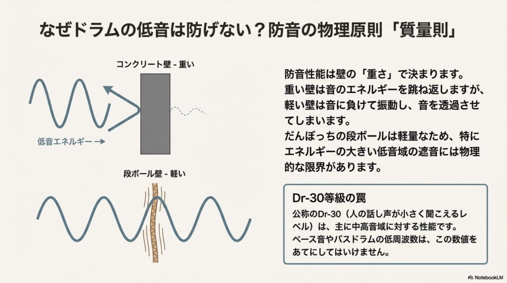 だんぼっちのような軽量な素材では、物理法則として「低音」を遮ることが非常に困難であるため、ドラムやピアノの重低音は壁を通り抜けてしまいます。