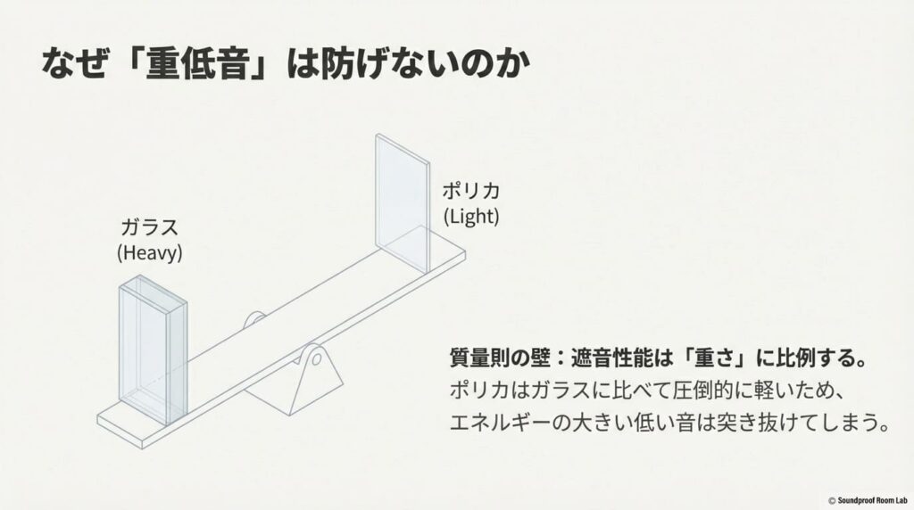 ポリカーボネートのような軽量な素材でも、気密性をしっかりと確保できていれば、中高音域の侵入経路である「窓の隙間」を塞ぐ役割を果たせます。