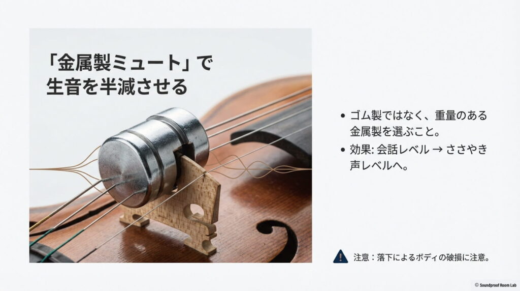 本記事では、サイレントバイオリンから発生する音の正体と、金属ミュートなどを用いた具体的な防音対策について解説します。