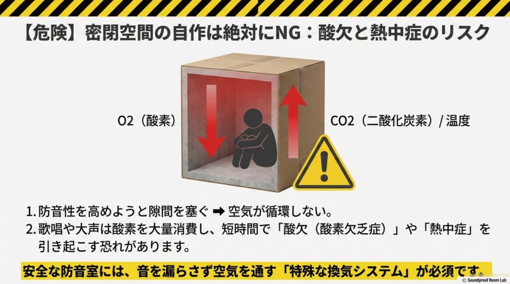実は、安価に作れるというメリットの裏側には、音響学的な効果の限界や、場合によっては酸欠や熱中症といった軽視できないリスクも潜んでいます。