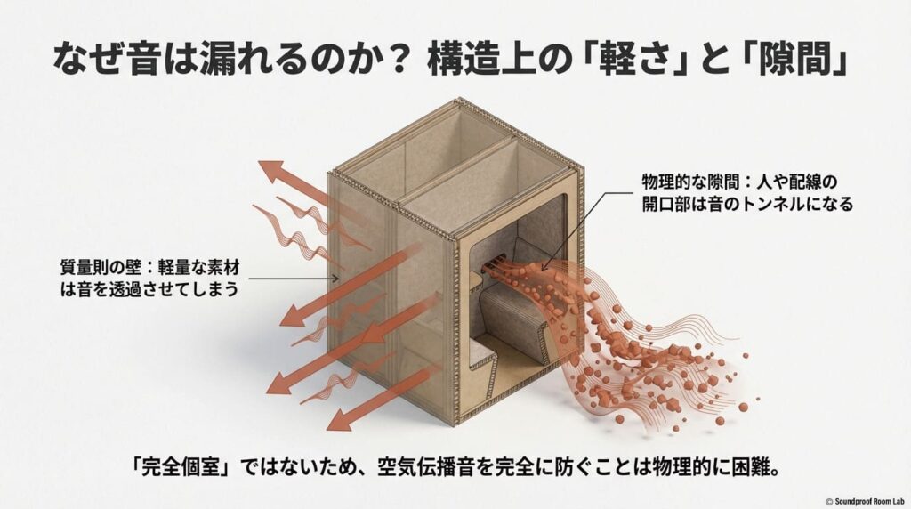 自宅で卓上防音ブースを使用しても音が漏れてしまう最大の原因は、ブースそのものの「軽さ」と「隙間」にあります。