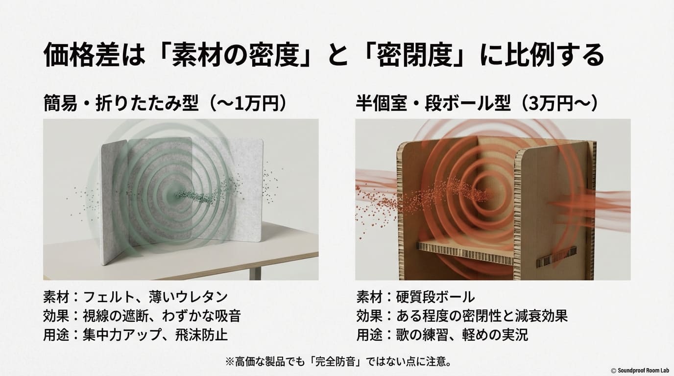 この価格帯の製品は、本格的な防音ではなく、簡易的な吸音と視界遮断を目的としています。