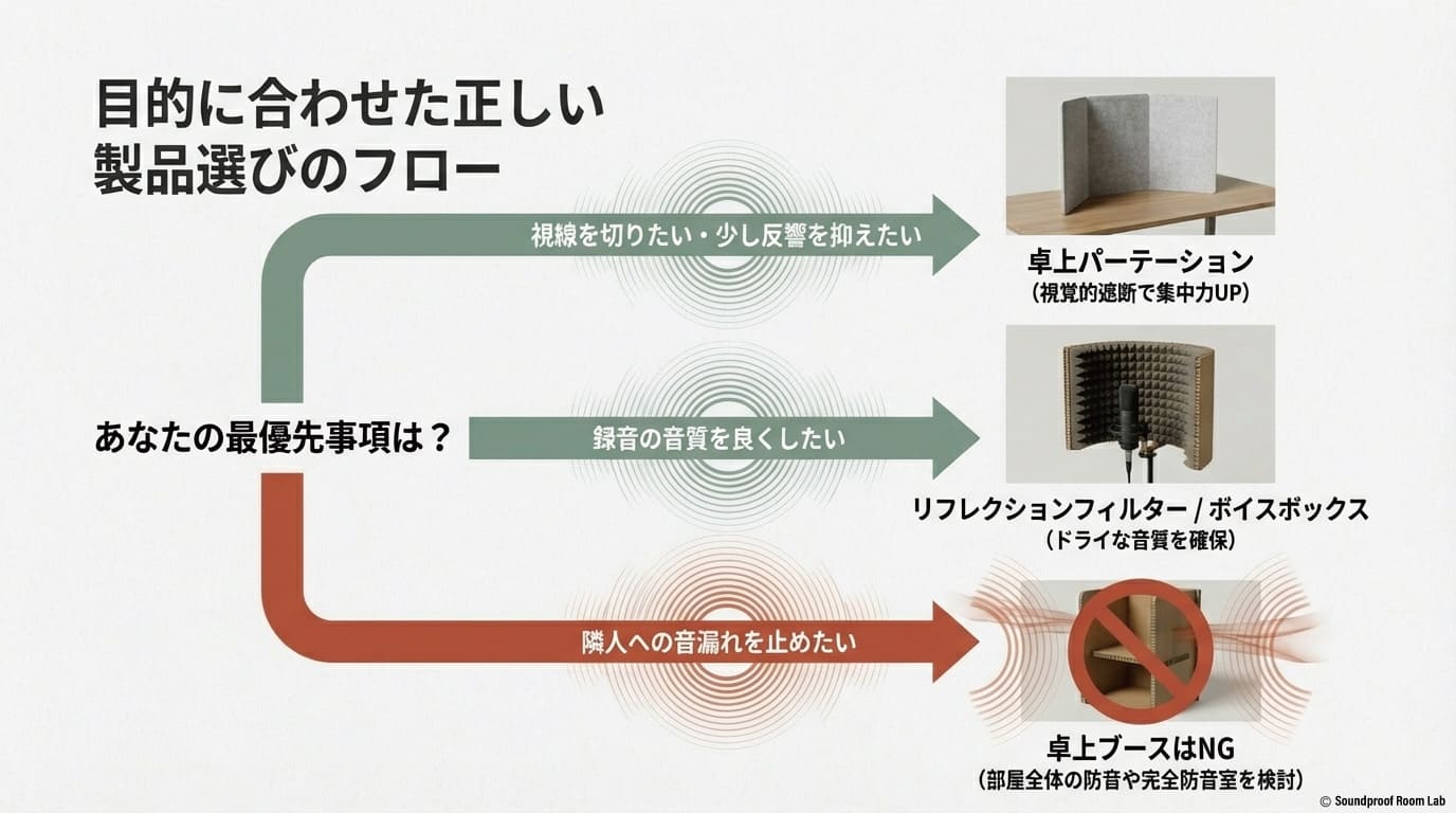 卓上タイプの防音製品を検討する際、最も重要なのはその製品が「何を目的としているか」を正しく理解することです。